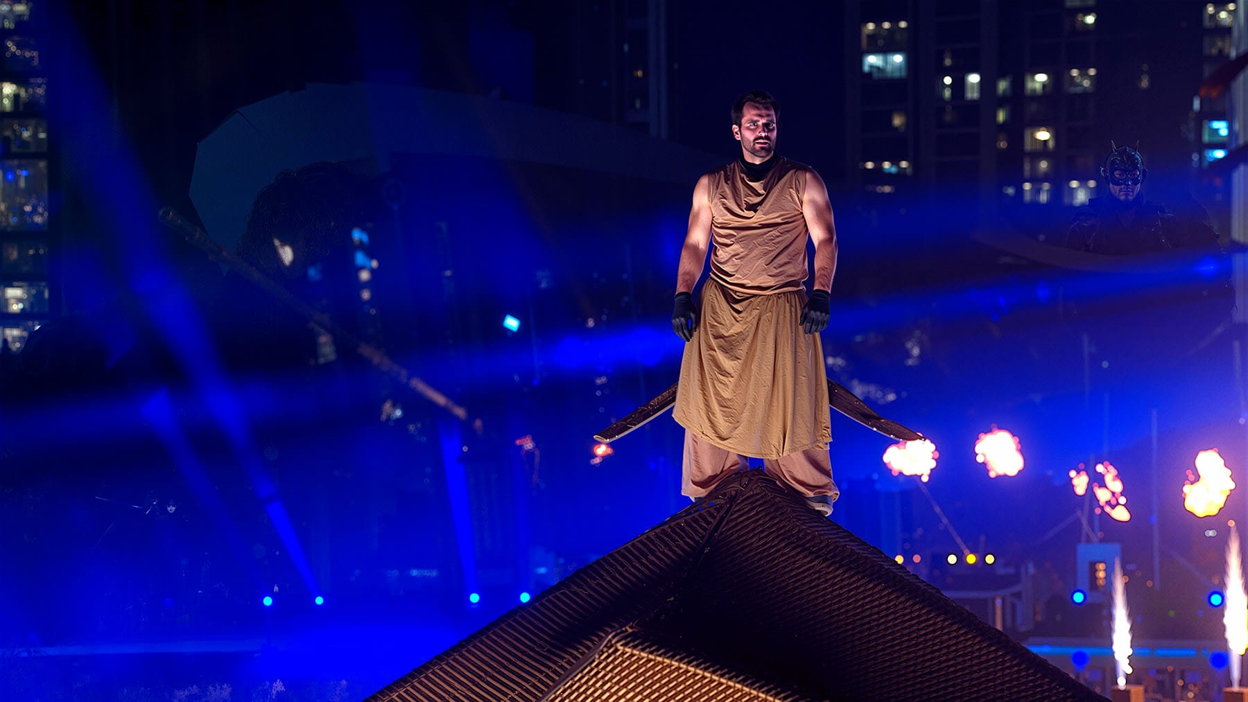 Twenty-five custom floats, boats, waterboards and jet-skis were involved – with a cast of 570, including a tightrope walker traversing a high-tension cable strung between points of the adjacent shopping mall – in a slickly choreographed performance.